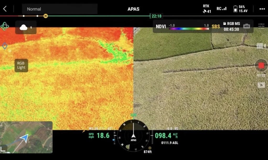 Versatility: Our drones can adapt to various terrains and crop types, efficiently covering fields with uneven landscapes or obstacles where traditional machinery struggles. Our drones can be adjusted on the fly changing the droplet size on a micron level to minimize chemical drift. Chemical application is fully customizable based on crop needs.